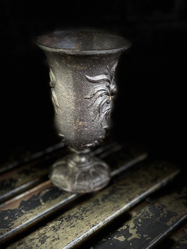 Deze metalen kelk heeft een spinnende bloem als afbeelding,