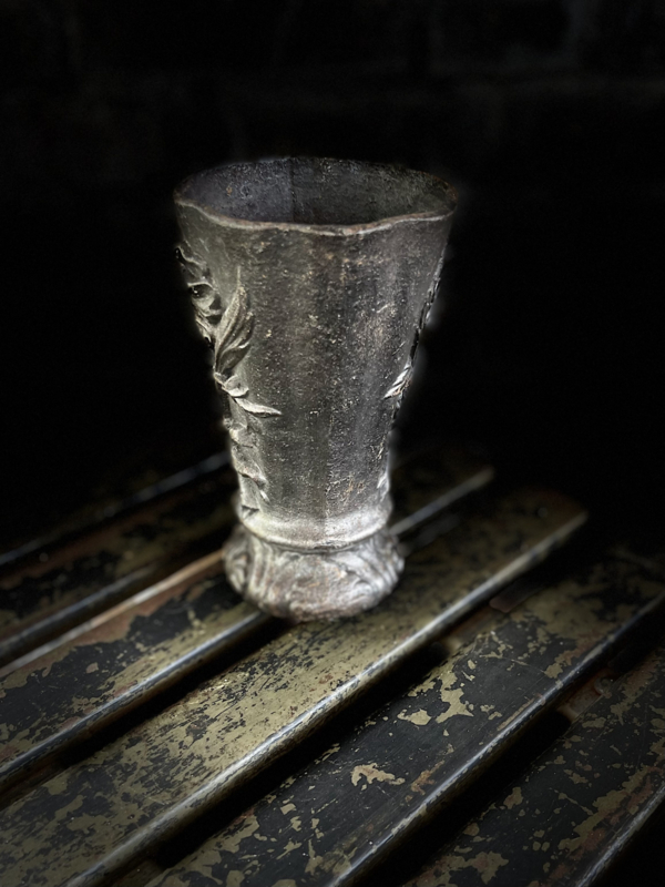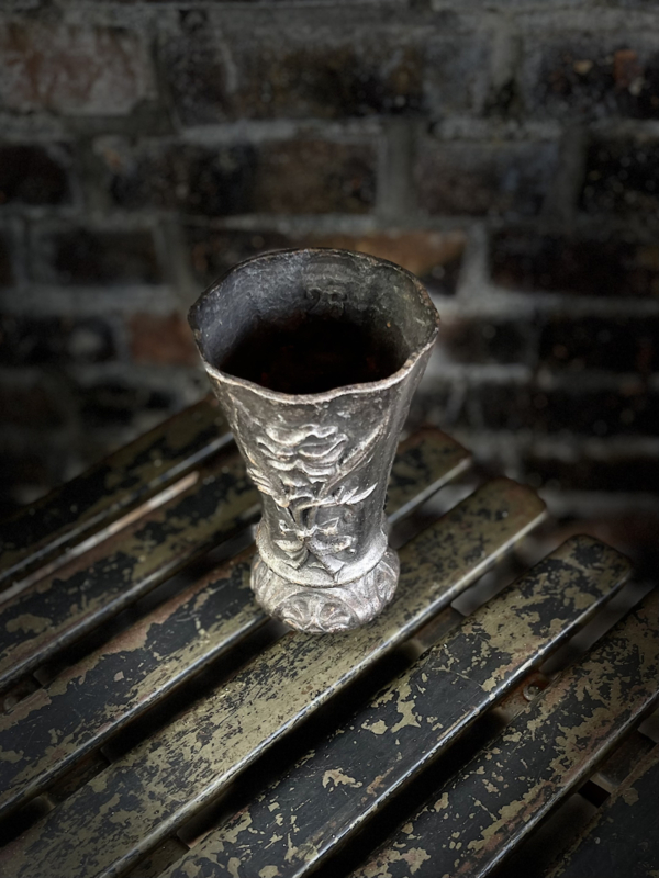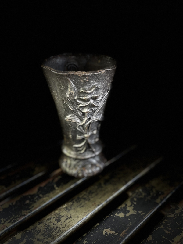 Deze metalen kelk heeft een bloem tussen takken als afbeelding,