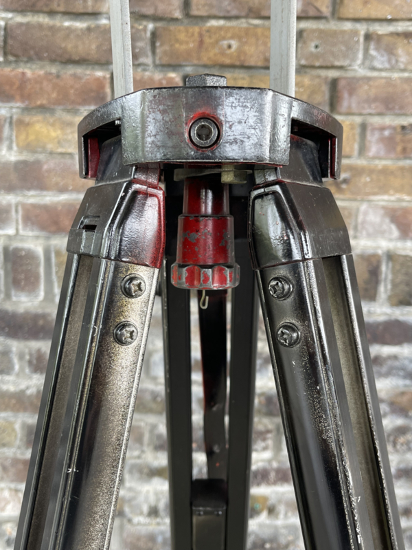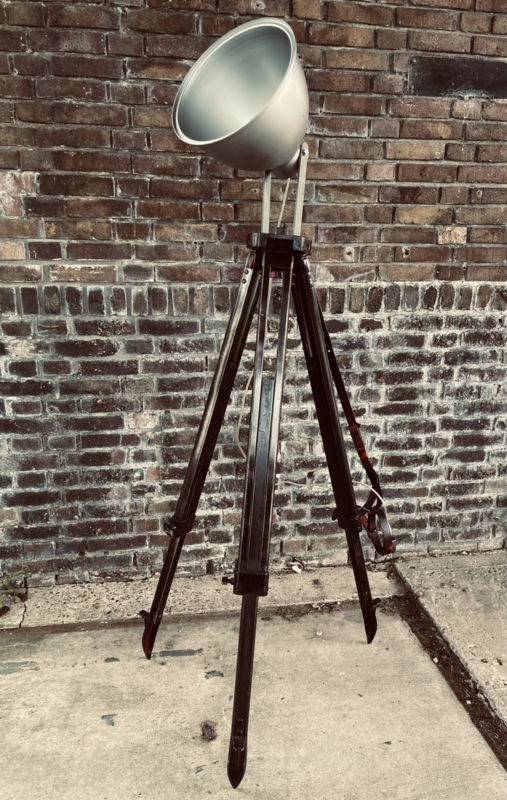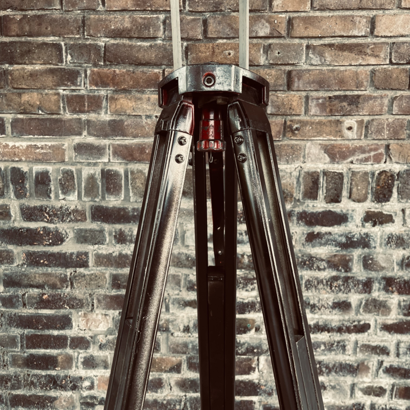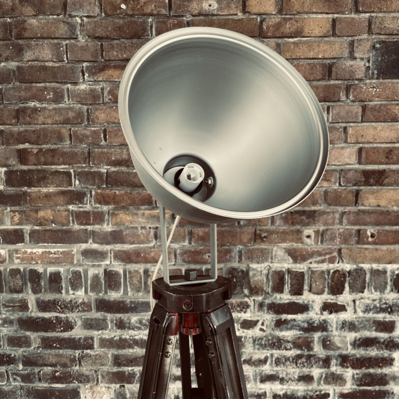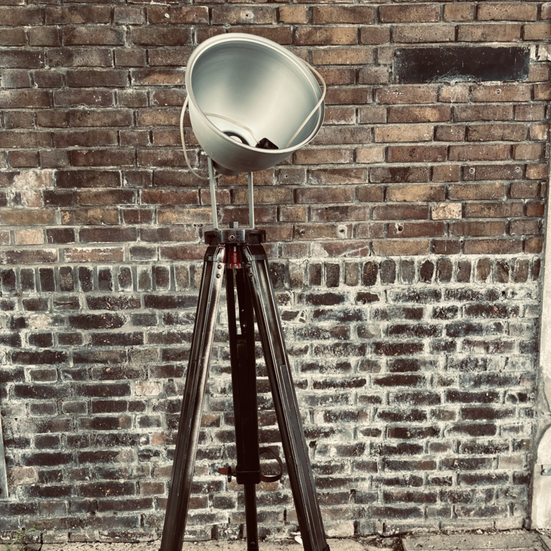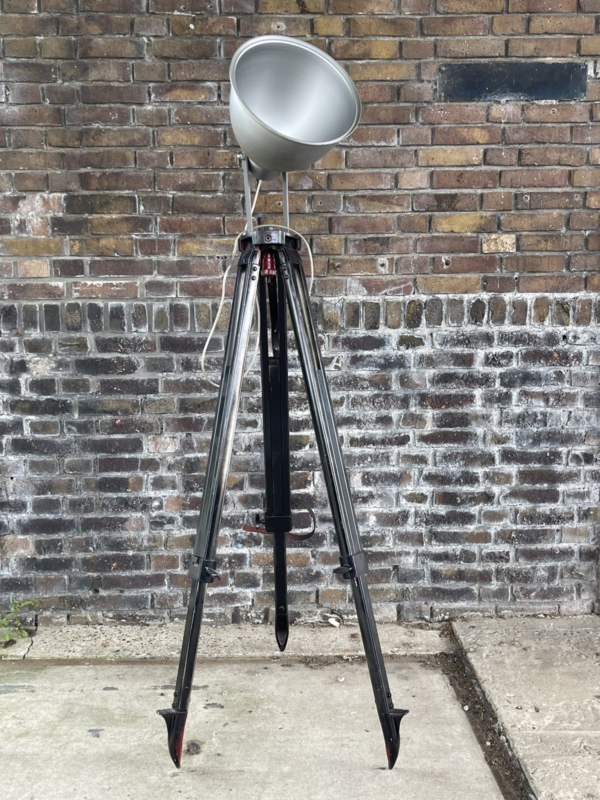 Industriële vloerlamp met een metalen verstelbare driepoot en een wendbare spot.